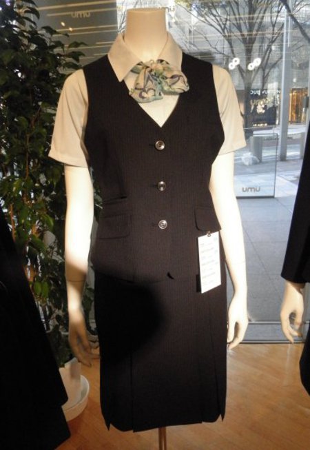 端正なセットアップが知的な正統派ベストのオフィス事務服です。ややラウンドしたVネックが女性らしい印象のストライプ柄ベストは、知的で品格溢れる印象に。表地・裏地どちらもストレッチ素材なので一切ストレスを感じさせません。スマホ専用ポケット「スマホルダー」など、収納力にこだわったポケットに、背ベルトはシルエットを調節出来ます。前左右に脚さばきがよく、デザインのポイントにもなるインタックプリーツを付けたAラインスカートは、適度にハリ・コシのあるストレッチ素材の為、型崩れしにくくお手入れが楽なのが嬉しいポイント☆更に、裏地の後ろ身頃を1枚取りにして強度の向上を図っています。ブルーのリボンを加えて涼しさと華やかさもきかせた、端正なセットアップのストライプオフィス事務服です。