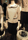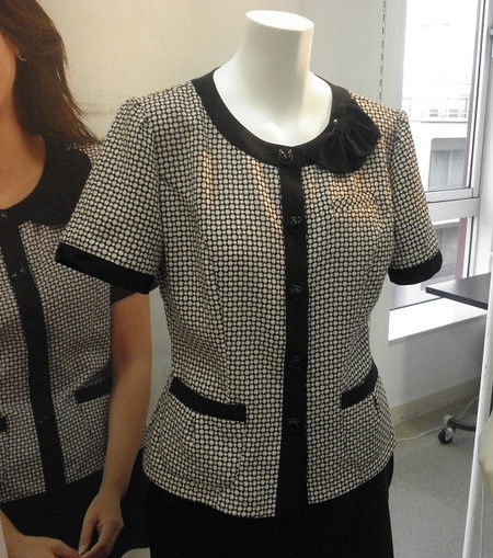 ポケットはタックを取り、柔らかいイメージに仕上げました。袖口はリボンに見えるようタックをとり、可愛らしさを演出しました。黒配色のリボンでバックスタイルをスッキリ見せます。