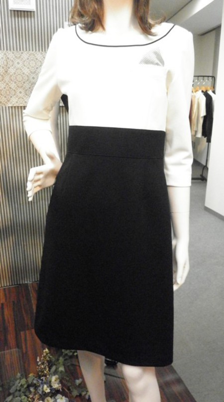 モノトーンバイカラーのワンピースはどんな雰囲気にもマッチし、おもてなしスタイルをワンランク上に格上げします。エステサロンの受付などにお勧めな上品レディなサービス業制服です。